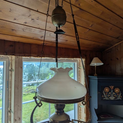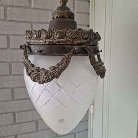 Lampen er i kobber og messing med frostet glasskuppler. Må hentes. Kun PM.