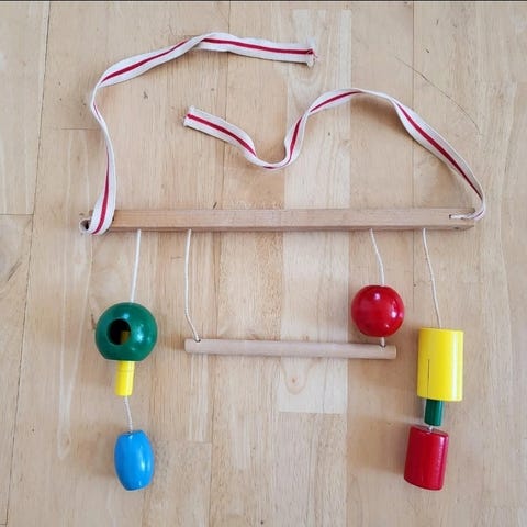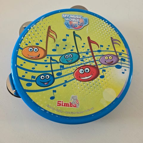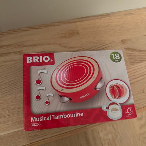 BRIO Tamburin barn leketøysinstrument i rød farge. Laget av tre og metall, egnet for barn. Designet for å brukes som rytmeinstrument i lek og musikkaktiviteter.
