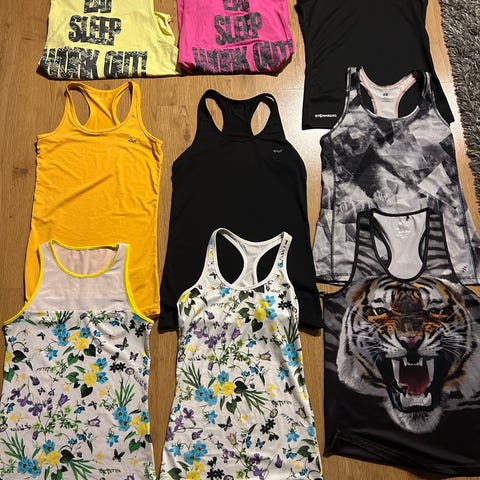 Det er med tungt hjerte at jeg må legge treningen på hylla. Mye er ubrukt. Lappene er klippet av og de fleste klærne er vasket da jeg alltid gjør det før bruk. Klærne kommer ikke til sin rett på bildene. Spør så sender jeg bedre bilder.