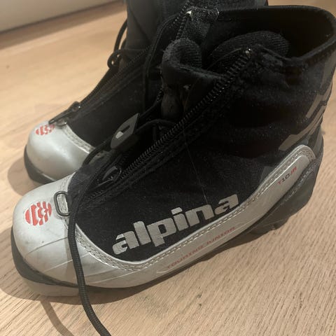Alpina skisko i størrelse 31 med svart og sølv farge. Skiskoene har glidelås foran og gummisåle med mønster for grep.