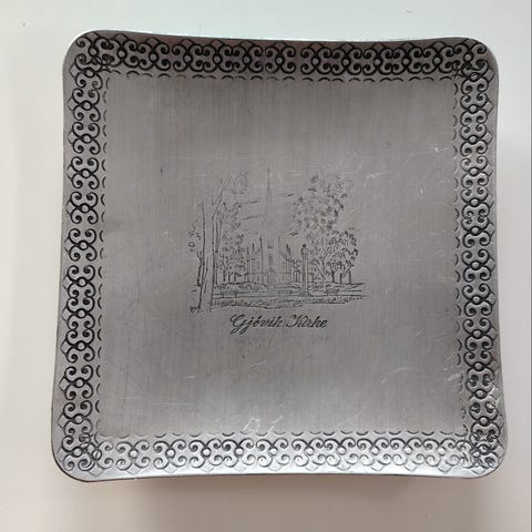 Fat av tinn med motiv av Lesja kyrkjene