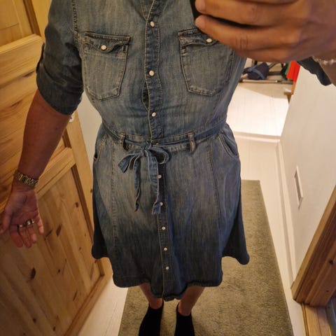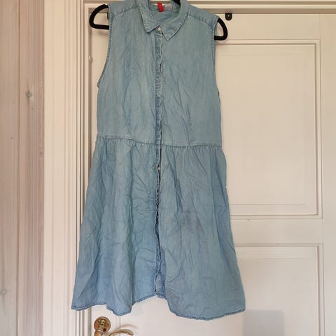 Lindex hverdagskjole i denim, blå farge, størrelse 44 for kvinner. Kjolen har knapper foran og brystlommer med knappelukking. Materialet er slitesterkt denim, egnet til hverdagsbruk. Lengde 91 cm