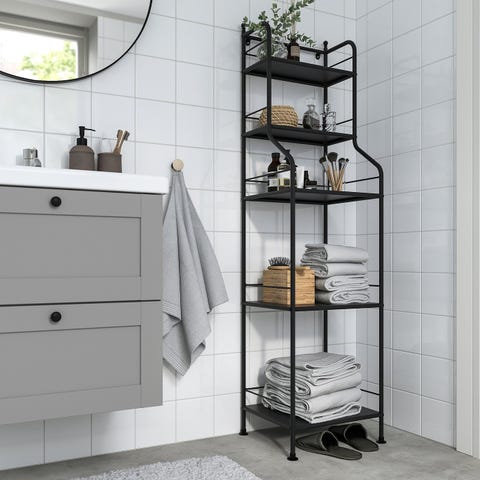 IKEA Alfred Homann reol med fire hyller i svart metall. Mål: 175 cm høy, 51 cm bred og 36 cm dyp. Designet for oppbevaring og organisering i hjem eller kontor.