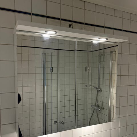 RFG speil med belysning, måler 50x60 cm. Speilet har innebygd elektrisk belysning med 230V, 50Hz strømtilkobling. Ramme i metall og glass, egnet for veggmontering.