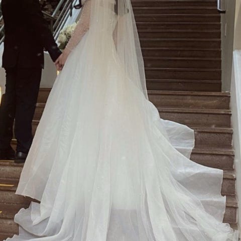 To delt brudesett. Topp og skjørt. Veldig vakkert på. Selges da jeg ikke fikk brukt det. Størrelse small.