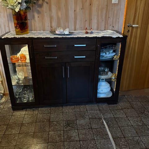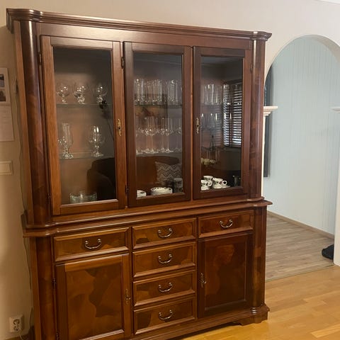Kjempefint vitrineskap i hvit og sort høyglans og glassdører, selges til oppgidd pris. Speil inni. Noen små hakk/ riper som stort ikke syns. Er velholdt og pent . Selges pga oppussing. Selger også skjenk i samme serie.