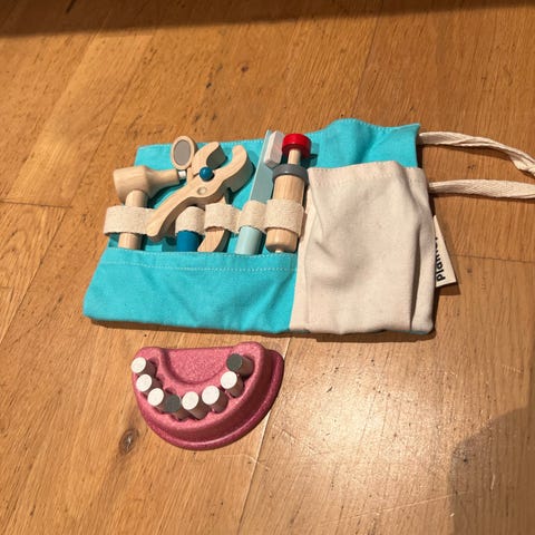 Rollelek. Munn, kjeve, tannkjøtt, tenner. Tang, bor, speil, tannkrem med magnetkork og tannbørste. Treleke. Magnetleke. Montessori. Pusse tenner.