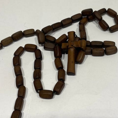 brukt til kristen bønn og meditasjon. Rosenkransen har perler i tre og et korsanheng, og kan brukes både som bønnredskap og som halskjede.