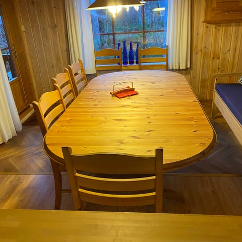 Pent brukt spisestue i nøttene med seks stoler. Bordet er i utgangspunktet rund på 110cm. Det følger med 2 ileggs plater a 50 cm hver så da kan de få en lengde opp til 210cm. Da passer det med alle seks stolene. Bordet og stolene har ingen store skavanker, men noen små bruksmerker. Plysj i stolsetene har vel falmet til en litt lysere farge med årene. Må hentes i Drammen, har ingen mulighet til å sende dette.