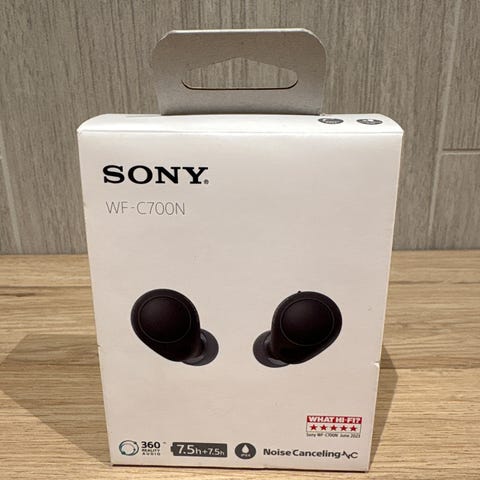 Sony WF-1000XM3 trådløse hodetelefoner med ladeetui. Hodetelefonene er sorte med røde detaljer og leveres med flere sett øreplugger i ulike størrelser for tilpasning.