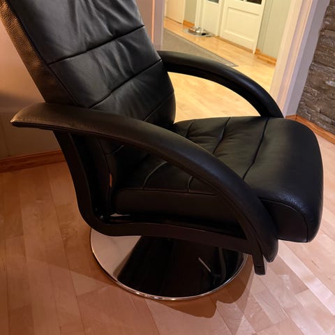 Denne fine lenestolen kjøpte vi på impuls for noen år tilbake, men den har bare stått nærmest til pynt i kjellerstua dekket med tepper. Nydelig og behagelig stol i en fin grønn farge, fløyelsaktig stoff. Ingen flekker eller skader, stolen har knapt vært sittet i. Nypris for stol og krakk var 15500 kr :)