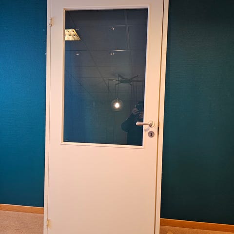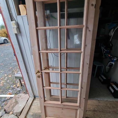 Glassdør med hvit ramme og blå dekor. Døren har flere glassfelt og er egnet for innendørs bruk. Passer for rom hvor det ønskes lysgjennomgang samtidig som det gir en viss grad av avgrensning.