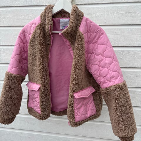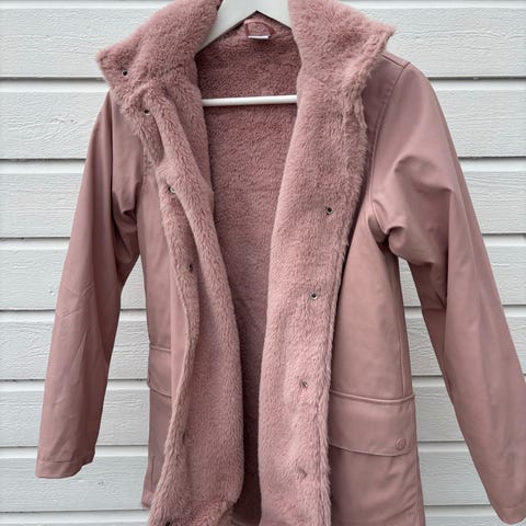 Lindex bomberjakke i størrelse 152, laget av polyester i rosa farge. Jakken har glidelås foran, lommer med knapp, og en liten glidelåslomme på ermet. Den er designet for barn og har ribbestrikkede mansjetter og kant nederst.Har noen flekker på armene og i front nederst på jakken. Se bilder