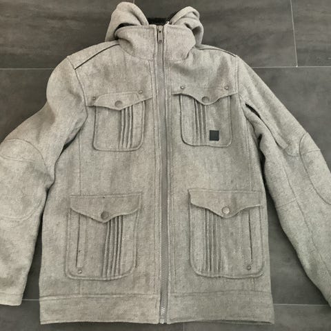Vinterjakke i størrelse L for menn. Jakken er brun og mørkeblå og laget av ull og viskose. Egnet for utendørs bruk i kaldt vær.