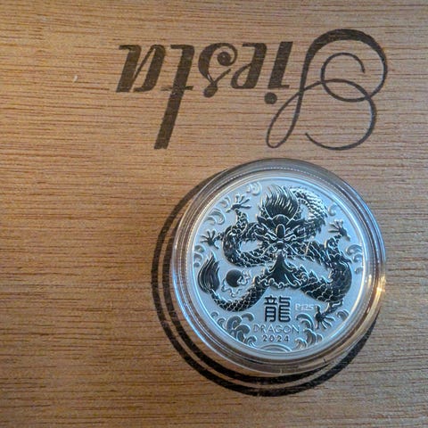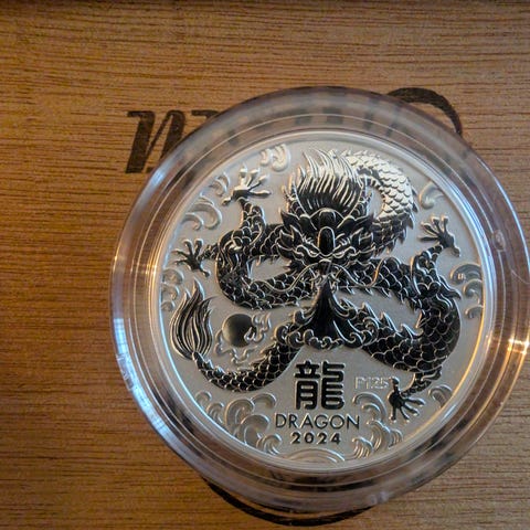 SELGER EN 2 OZ LUNAR SØLVMYNT 9999 SØLV. YEAR OF THE DRAGON 2024 .MYNTEN ER HELT STRØKEN SOM NY , HAR ALDRI VÆRT UT AV KAPSELEN . SELGES FOR 3500KR . KAN TREFFES I ÅSANE OMRÅDET . TAR OGSÅ I MOT VIPS .