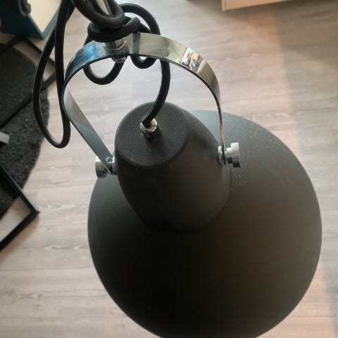 Pent brukt taklampe bestående av ledning med bryter og sokkel, og en hvit rund lampeskjerm. Selges med pære.