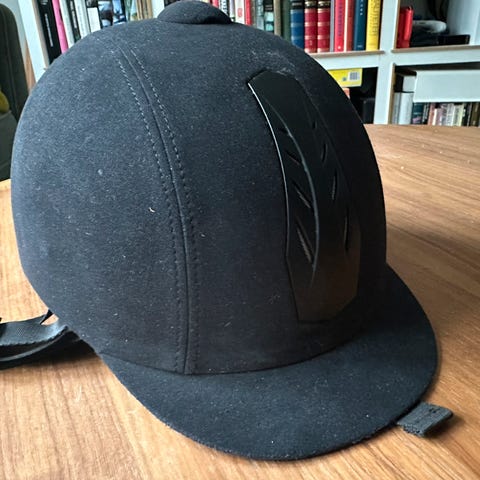 Horze ridehjelm i størrelse large, 58-60, med svart farge. Hjelmen har ventilasjon og justerbar hakestropp.