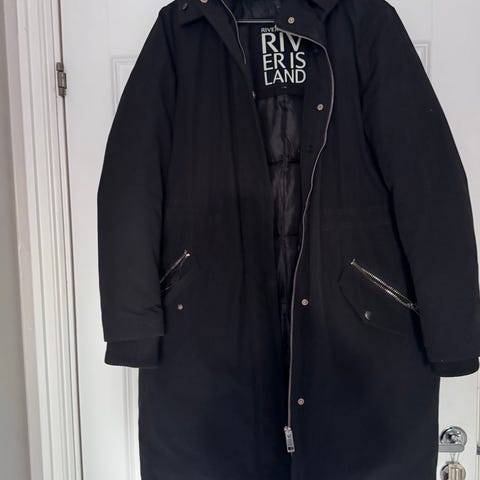 River Island Annet yttertøy i fuskeskinn i fargen svart, størrelse M for damer. Jakken har belte i livet og pelskrage, og er laget av syntetisk materiale. Krage kan tas av brukt 2 ganger