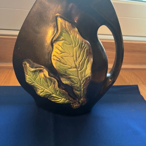 Vakker og dekorativ vase med håndtak. Håndmalt dekor i lyse toner med brunt, blått, grønt.