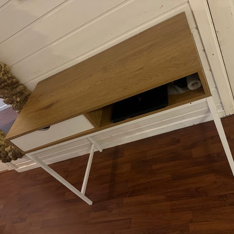 Pent skrivebord selges. Stått på gutterom og dessverre blitt skrevet på, mulig det går bort med litt mer innsats for å få fjernet det enn hva jeg ga det. Alt i orden ellers, pent bord, “tungt” og solid :) må hentes. Stol og katt følger ikke med ;)