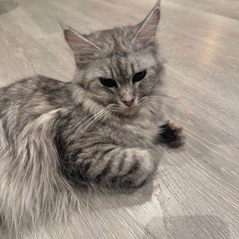 Sjasmin er en flott, sortsølv ticket skilpadde Maine Coon hunnkatt som trenger et nytt, varig og godt hjem. Sjasmin er født 02.11.2021, og er nå pensjonert. Hun er en veldig snill, sosial, kosete og god jente. Hun er en katt som liker å være med på ting som skjer og er fremdeles leken. Hun har et flott sølv og en fin pelskvalitet. Sjasmin er ikke vant til å gå fritt ute, kun i kattegård.
