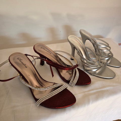 River Island Hæler i størrelse 37, laget av rød semsket skinn. Skoene har høy hæl og glidelås bak for enkel på- og avkledning. Passer til bruk ved anledninger som krever formell eller finere fottøy.