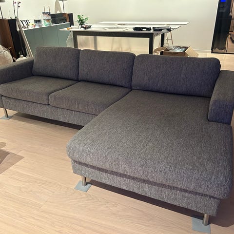 Pent brukt 3-seter Bolia Scandinavia sofa med sjeselong til venstre, i stoffet London Light grey. Dunfyll. Hvitoljede ben. Selges da størrelsen dessverre ikke passer i vår nye stue.