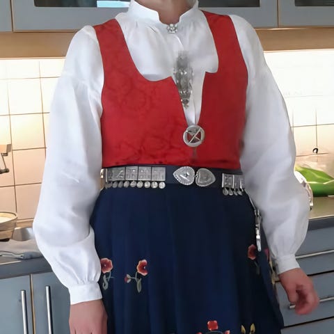 Med tungt hjerte vurderer jeg å selge min håndbroderte bunad med to forklær og alt av tilbehør, inkludert håndlaget bunadssølv.