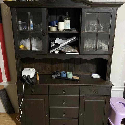 Vitrineskapet er helt og greit, fint og praktisk møbel som går inn de fleste plasser, ingen synlige skader eller skavanker, men er kuttet plass til stikkontakt inni skapet.