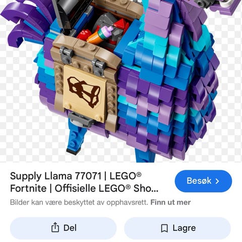 Jeg selger denne da jeg har kjøpt dobbelt, og har ikke kvittering så jeg får levert den igjen. Det er bilde av en ferdig bygget Lama, bare for å vise hvordan den blir :)