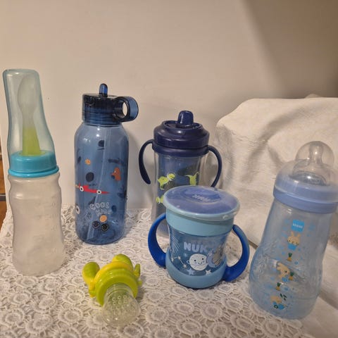 Stål termo drikkeflaske, Camelbak drikkeflaske med tut (plast), og Moomin tutkopp. Alt er pent brukt og feilfritt bortsett fra termoflasken som har fått et par minimale, nesten usynlige bulker.