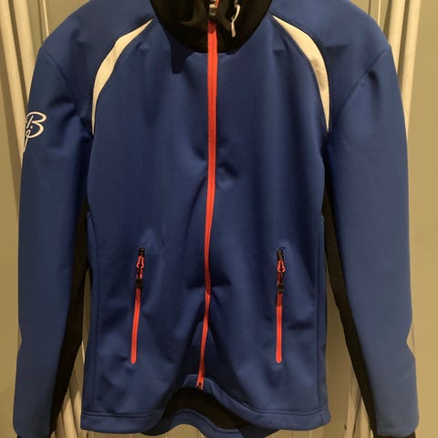 Helly Hansen jakke i fargene oransje og blå. Jakken har glidelåser og borrelåsjustering på ermene. Brukt som skijakke. Lommer fremme. Lett vattert.