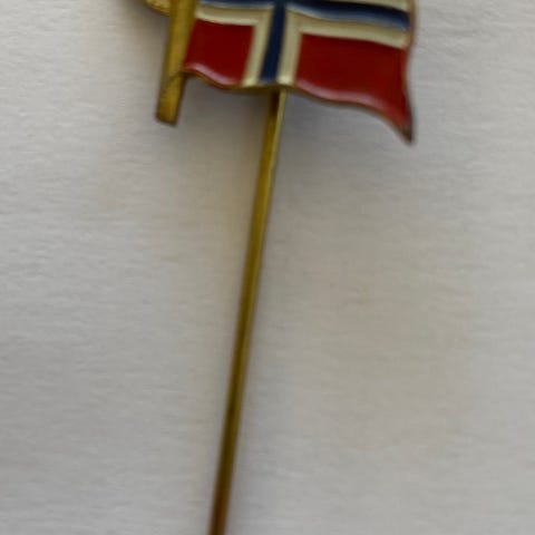 Sett med pins som inkluderer et norsk flagg og en løve. Pinsene har detaljer i farger og metall, og kan brukes til dekorasjon på klær eller tilbehør.