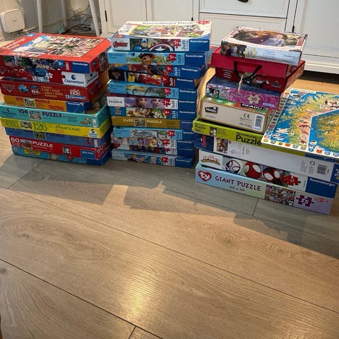 Samling av puslespill med varierte motiver som inkluderer landskap, kjente bygninger, dyr og tegneseriefigurer. Puslespillene kommer i forskjellige størrelser og antall brikker, egnet for ulike aldersgrupper og ferdighetsnivåer.