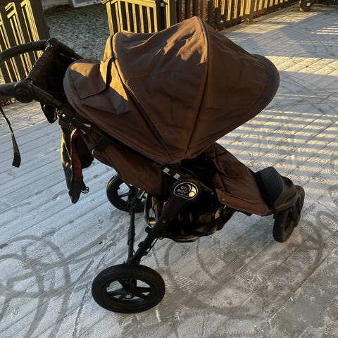 Baby Joggevogn barnevogn med tilhørende bilsete i svart og rød farge. Utstyrt med tre store hjul for god fremkommelighet. Låsbart fremhjul for jogging. Veldig enkel å slå sammen. Luftig og fin på varme sommerdager. Vognen har justerbar sitteposisjon og fire koppholdere. Fikk med både vogn og barnesete i prampack så den ble med hjem. Hjulene har litt synlig bruk fra sand og saltvann men fungerer fint. Triller veldig lett og hvis forhjulet er ulåst er den utrolig enkel å manøvrere. Kjøpt i usa for å bruke i by og på strand og passer fint til dette.