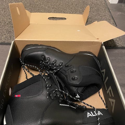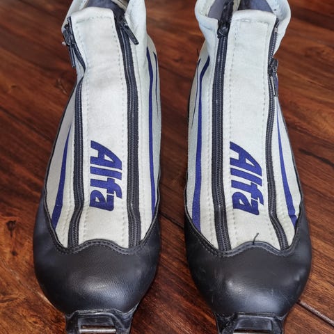 Alfa sko i størrelse 42, svart farge. Skoene har glidelås foran og perforert materiale for ventilasjon. Goretex. Brukt på en kort skitur. Kan sendes, men kjøper må betale porto.