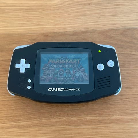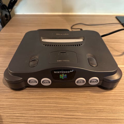 Nintendo 64 spillkonsoll med to kontroller i gjennomsiktig design. Konsollen har standard tilkoblinger og knapper, og kontrollerne har flere fargeknapper og joystick. Fungere som den skal