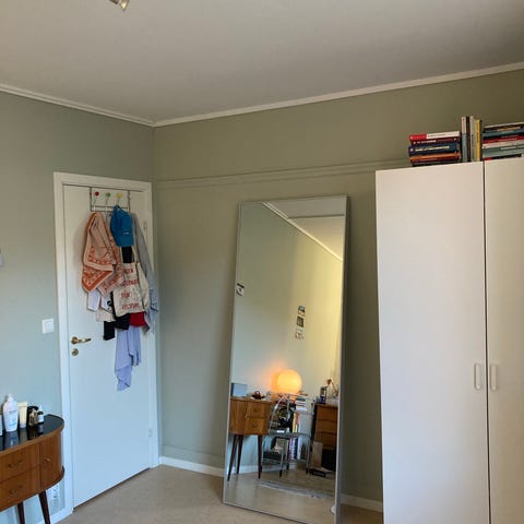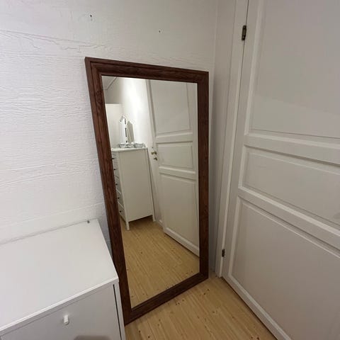 Speil fra IKEA Stockholm-serien i valnøttfiner selges. Diameter 80cm.