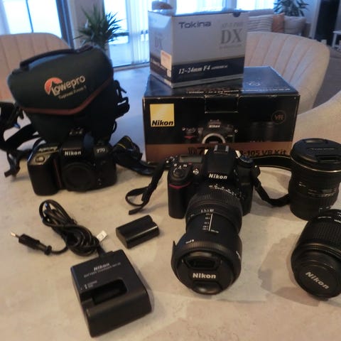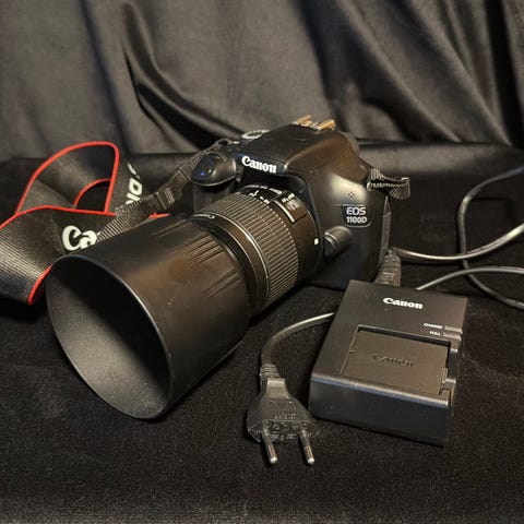 Canon EOS 10D speilreflekskamera med utskiftbart objektiv. Kameraet har en sølvfarget kropp og er designet for fotografering med avanserte funksjoner. Leveres med Canon EOS kamerastropp.