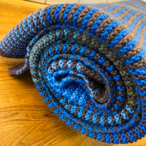 Strikket i Karisma, 100 % ull. Blokket. Selges kr 1350. Mange nøster er brukt, så det er ikke gratis å strikke et slikt teppe. Bruker kun posten ved sending.