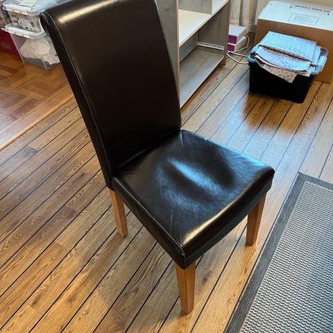 6 stk Spisestuestoler i skinn med bein i eik gis bort samlet. Sittehøyde er 48 cm. Dybde: 52 cm, Høyde: 108 cm, Bredde: 45 cm.