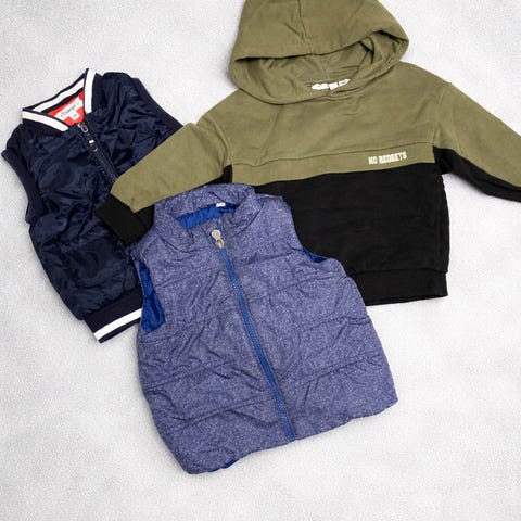 Sett med barneklær for gutt i størrelse 80 med flere plagg i forskjellige farger og mønstre. Inkluderer bodyer, cardigans, heldresser og bukser i ulike materialer og farger som beige, blå, gul, svart, grå, grønn og flerfarget. Plaggene har langermede design og varierte dyre- og mønstertrykk.