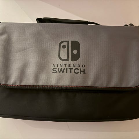 Nintendo Switch bæreveske i svart og grå farge. Vesken har skulderrem med polstret del og håndtak for bæring. Innvendig er det flere lommer og rom for oppbevaring av Nintendo Switch og tilbehør.