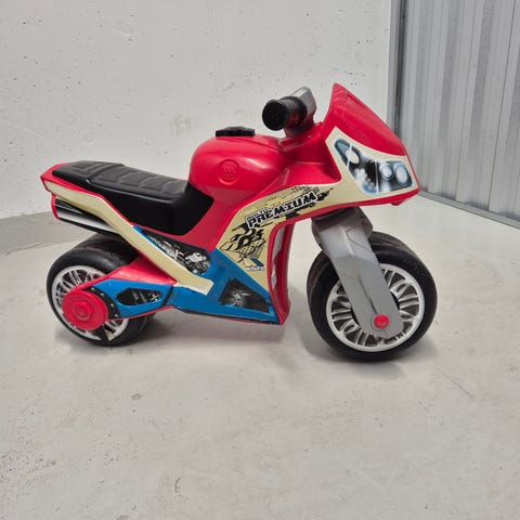 Kjører både fremover og bakover. Mener den har lys bak også, men har ikke testet dette. Følger med lader og må lades før bruk.