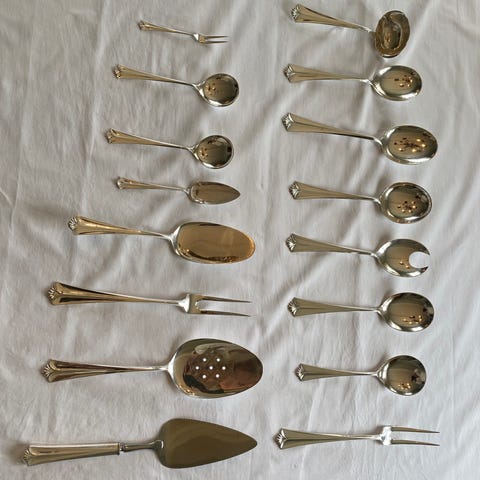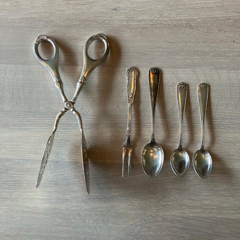 Ostekniv, nøtteknekker, sukkerklype, liten skje- alt i nysølv . Selges samlet kr 400.
