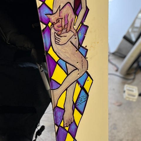 Lib Technologies / LibTech Jamie Lynn Space Cowboy 1996 Snowboard med bindinger. Snowboardet har et fargerikt design med motiv av en Space Cowboy på hest og regnbueaktige farger. Kan selges uten bindinger. Bent Metal bindingene er ca 10 år nyere enn brettet.