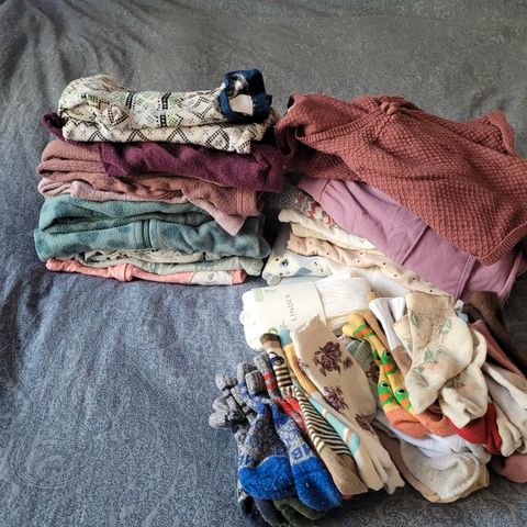 Utvalg av barneklær for jente i størrelse 80 med rosa fargetoner. Inkluderer gensere, kjoler, bodyer og bukser.