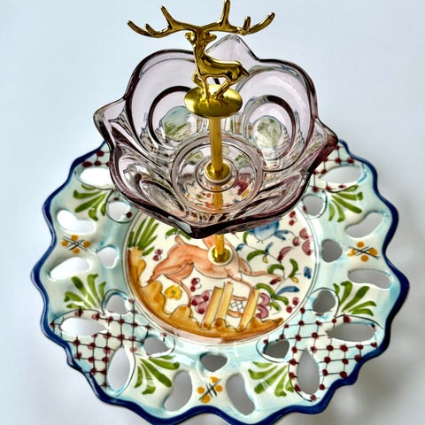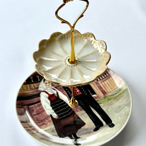Bjørnebær med rosa og gull kant rundt. Se mål og tilstand på bildene. Har krakeleringer og en gjennomgpende flekk, men hel og blankt og uten skår. Kan sende, ikke fiks ferdig eller helt hjem