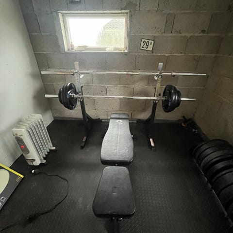 Squat rack, treningsbenk, olympisk vektstang med vektskiver
