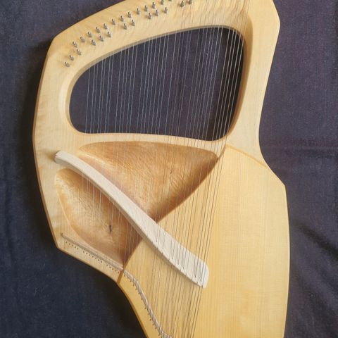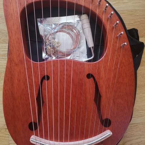 Rayhorn Autoharpe musikkinstrument med flere strenger og knapper for tonevalg. Instrumentet har en trekropp med mørk trefinish og hvite knapper med tall. Passer til bruk i ulike musikalske sammenhenger.